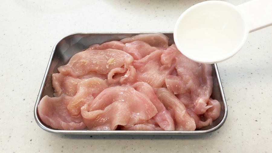 鶏のむね肉200gは一口大のうす切りに。