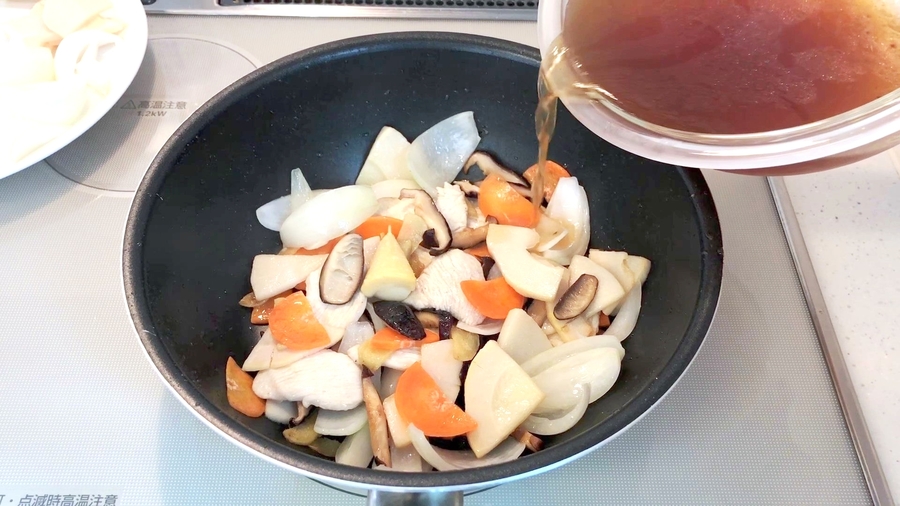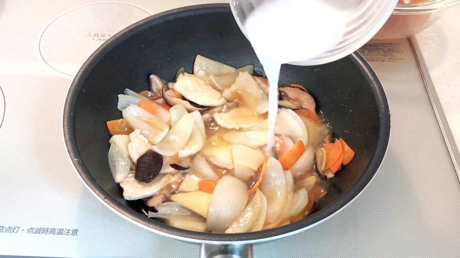 ニンジンも加え、ざっと混ぜ合わせて、あらかじめ用意しておいた合わせ調味料を加えます。
