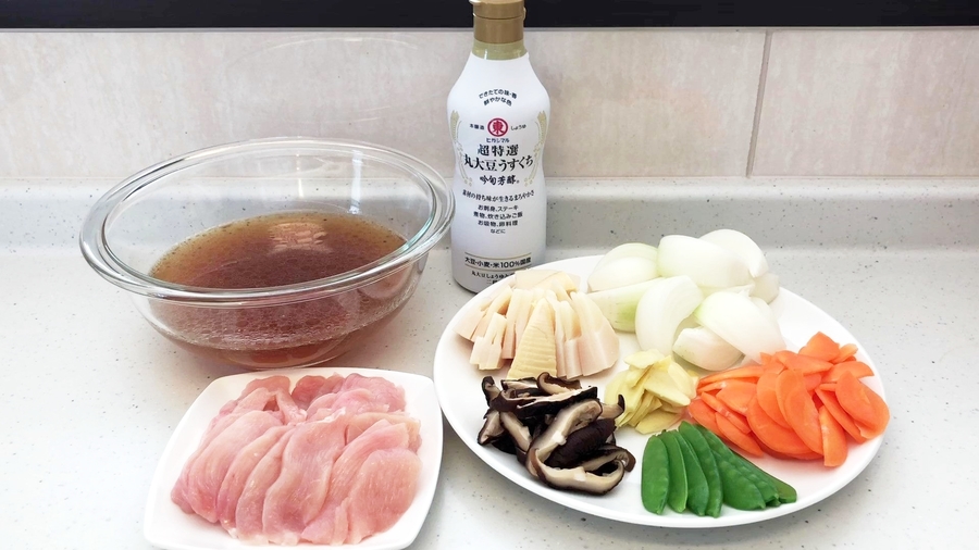 水煮のタケノコ100g、干しシイタケ4枚は戻してうす切りにしてください。