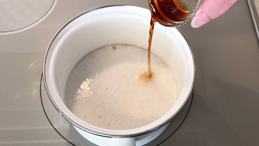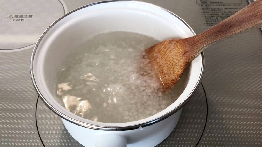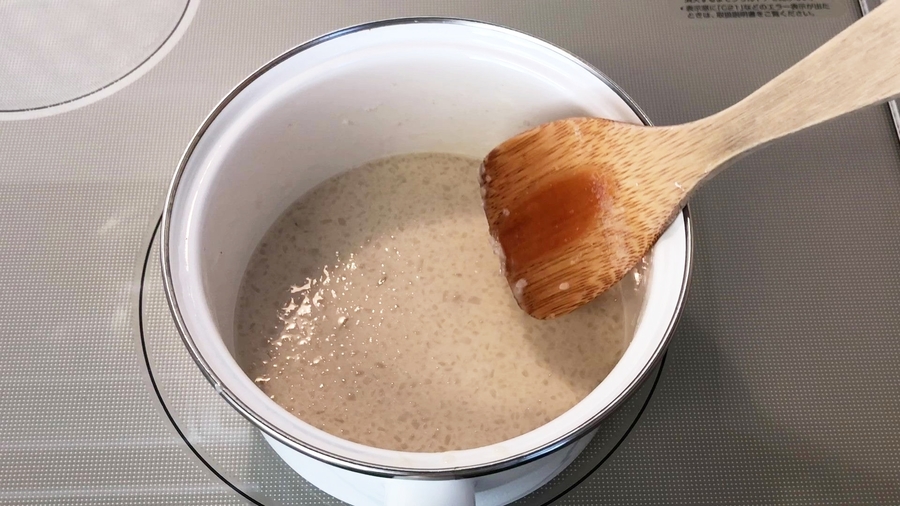 絶えずかきまぜ、透きとおり粘りが出てきたらさらに火を弱め4~5分練ってください。