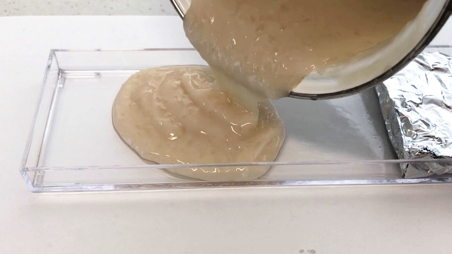鍋底が見えてきたら、油を薄く塗った型に流しましょう。