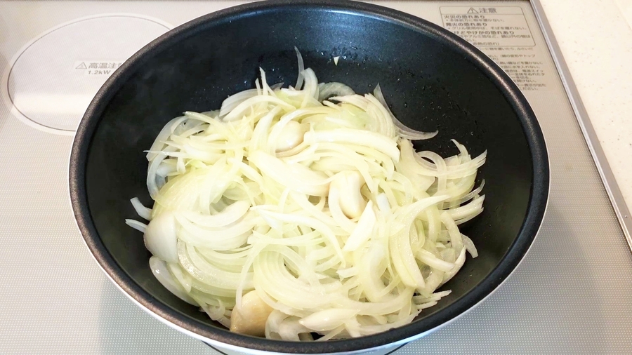 玉ねぎを加えて7~8分炒めたら別皿に移しておきます。