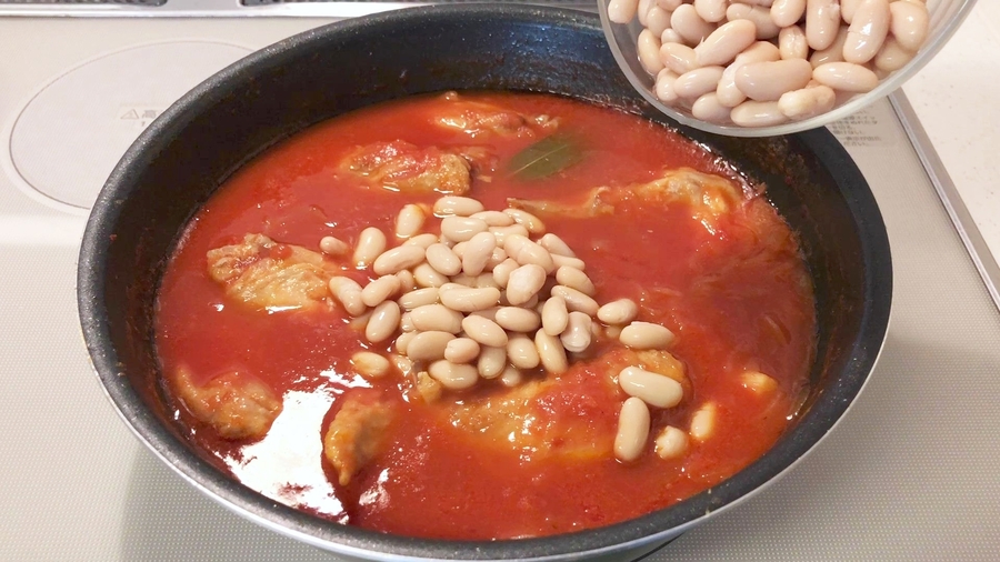 30分経ったら白いんげんを入れ、酢、淡口醤油、みりんで味を調えながら2~3分煮込みましょう。