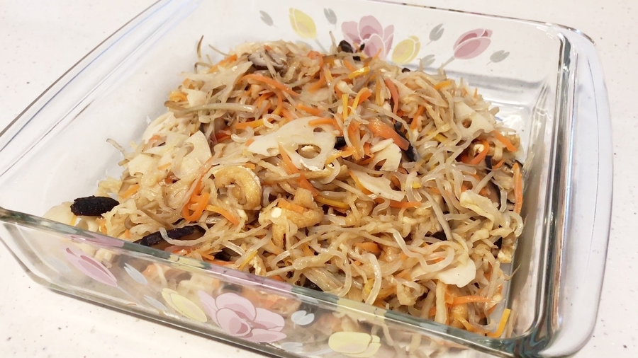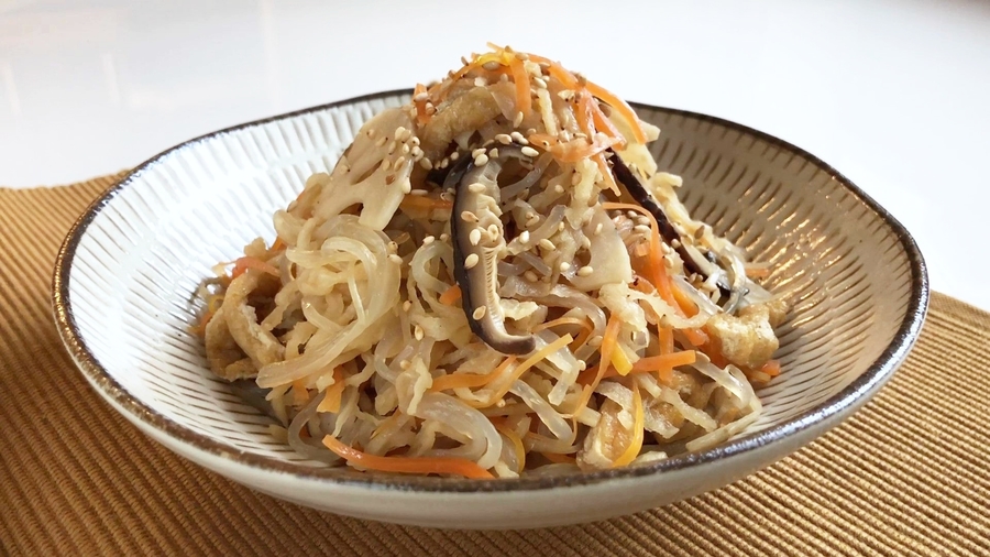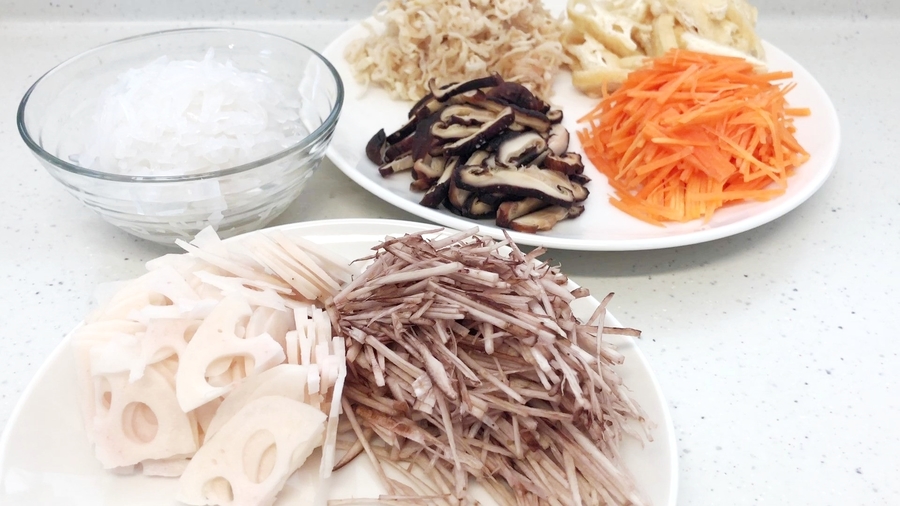 ゴボウとレンコンは、それぞれ酢水に5分くらいつけてさらし、水洗いしてザルに上げてしっかりと水を切ってください。