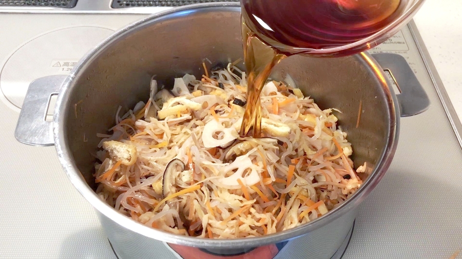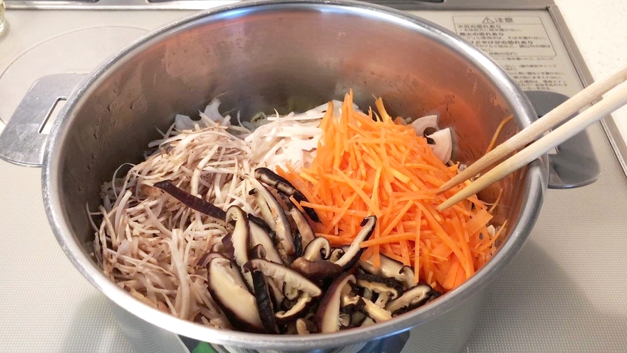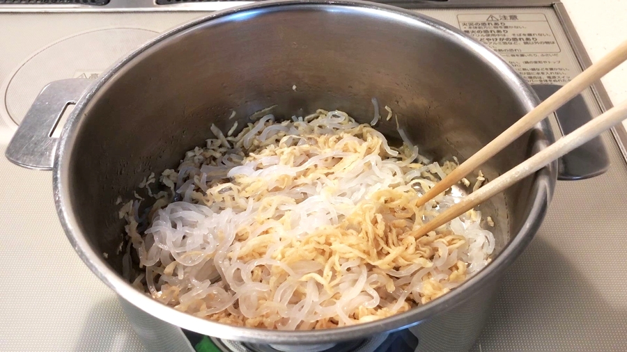 そして切り干し大根の周りが艶っぽくなってきたら、しっかりと水気を取った、しらたきを入れて炒めます。