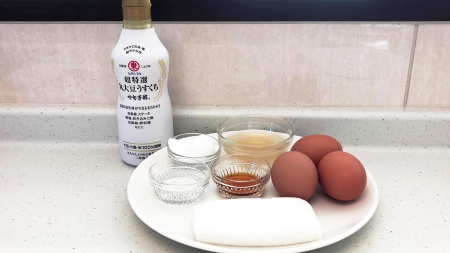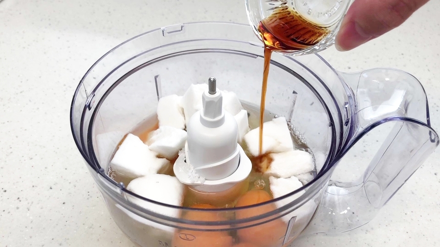 卵(3個)とおおまかにちぎった白はんぺんと、調味料(酒 大1、砂糖 大2、淡口醤油 小1/2)と水(1/4C)をミキサーに入れて、ダマがないようにかけます。
