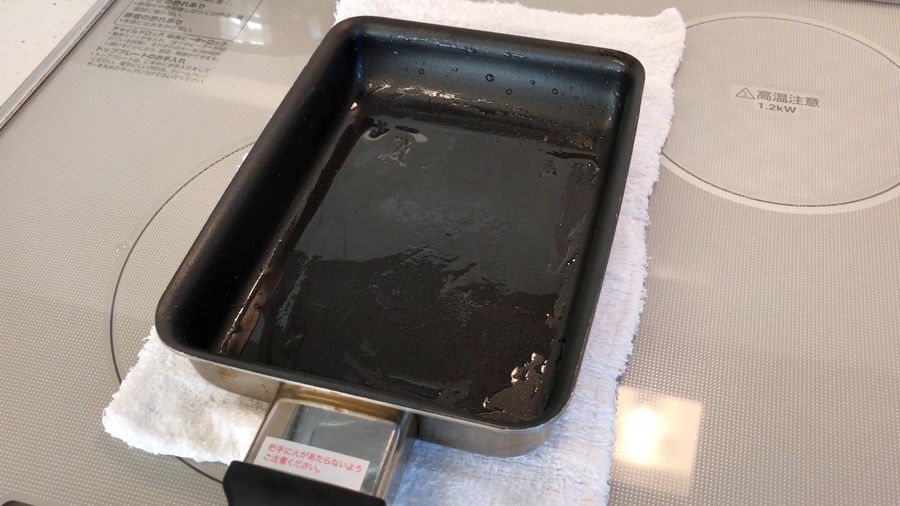 十分に油をなじませたら火を止めて、余分な油をふきとり、ぬれ布巾の上に置いて、フライパンをさまします。