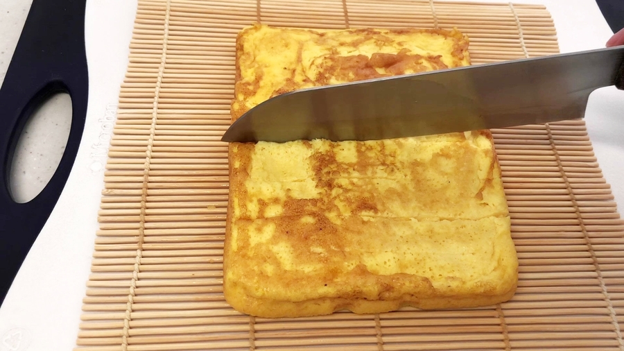 まきすの上に焼き上げた玉子焼きを縦長に置き、ロールケーキを作るときのように、1センチ間隔に切り込みを入れていきます。