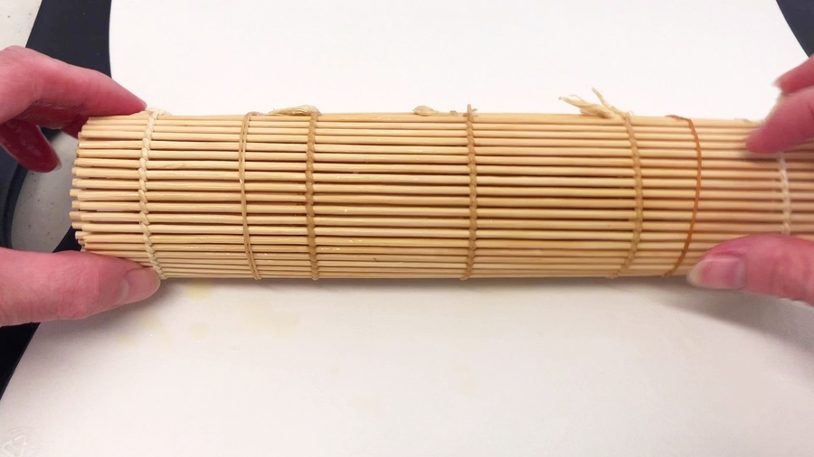 のり巻きのようにクルクル巻き、まきすの上から輪ゴムをかけて、冷めるまで置きます。