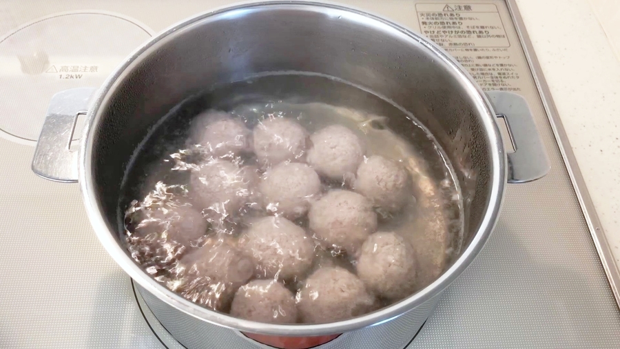 鍋に分量の水(4c)を入れ、煮立ったところに、先ほど作った12個のモチモチ団子を入れ、
