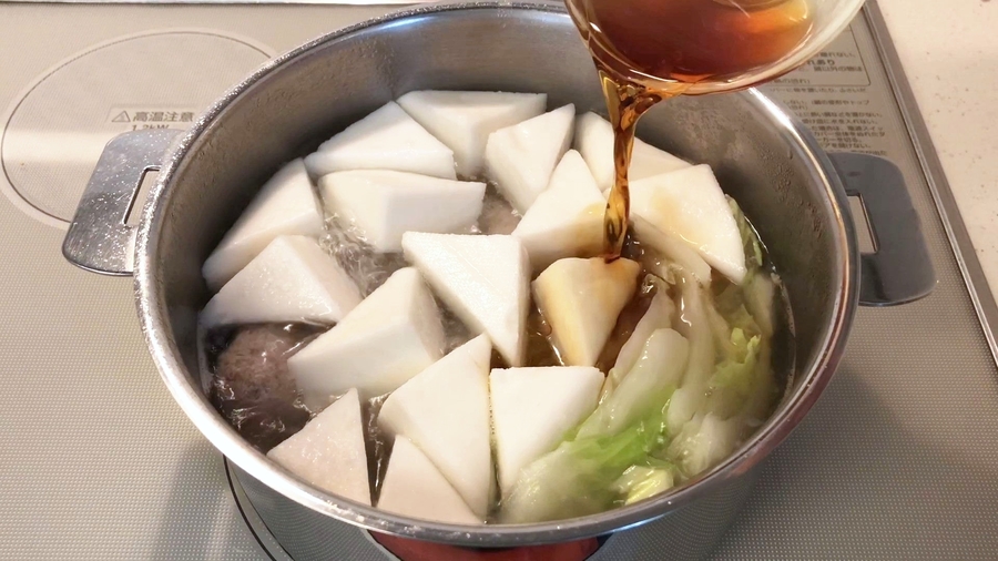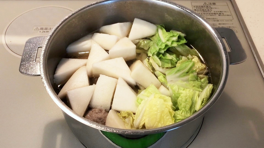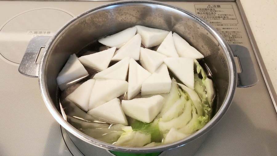 そこに白菜の芯と白はんぺんを入れ、さらに1~2分煮ます。