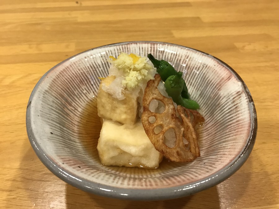 ※しし唐辛子やレンコンのうす切りを素揚げにして、⑤に添えると
