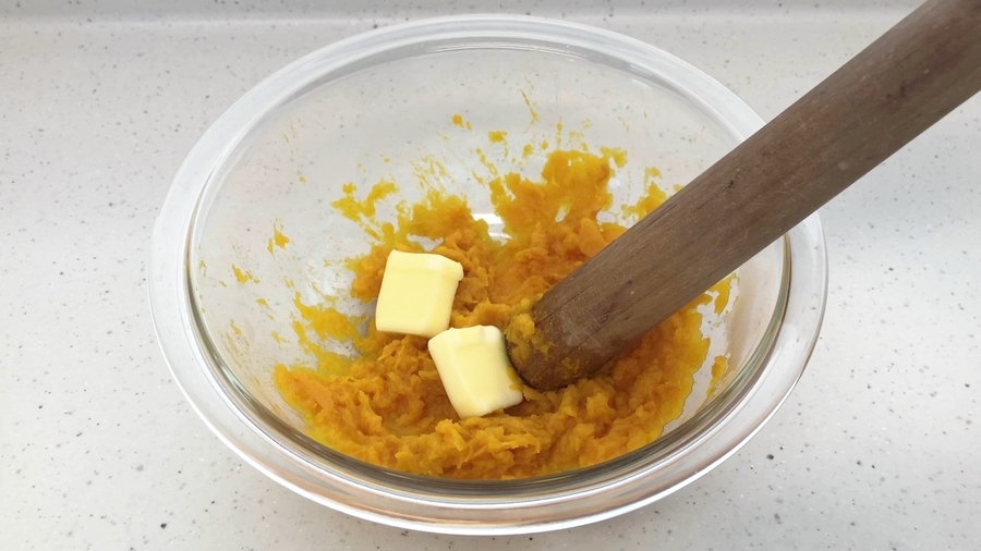 カボチャが熱いうちにつぶして、無塩バター20gを一緒に入れます。