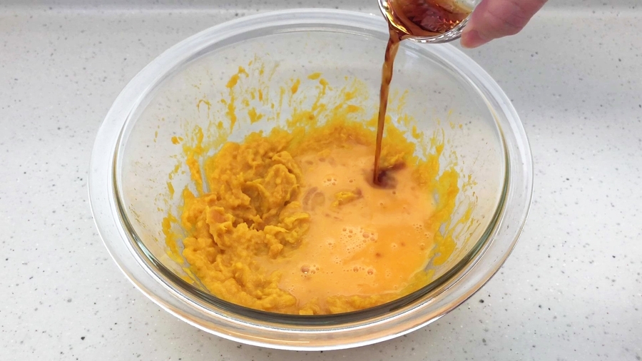 カボチャとバターをつぶしたものが冷めたら、溶き卵を加えてます。