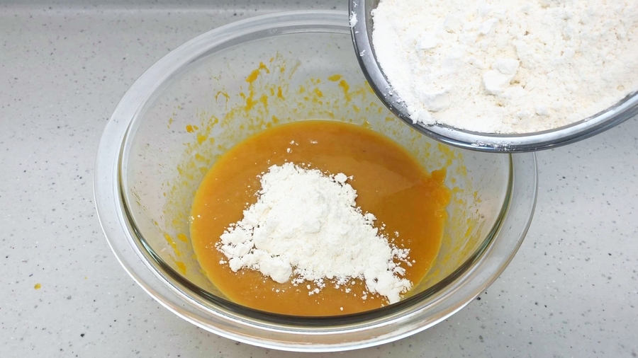 続いて、ホットケーキミックス150g(1袋)と薄力粉50gを混ぜておいたものを2,3回に分けて、カボチャのすりつぶしたものに入れます。