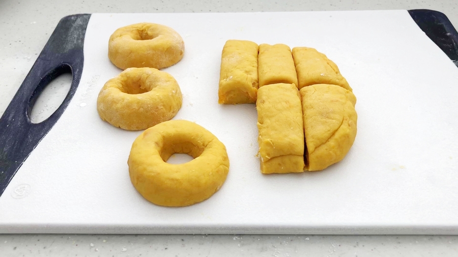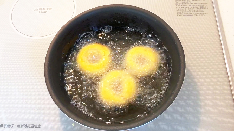 丸いままではなく、ドーナツの穴が開いているほうがうまい具合に火が通りますので、ドーナツの形にしてください。