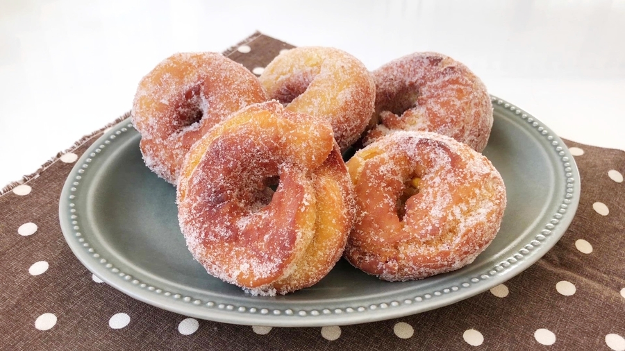 揚げ終えて、バットの上に置いて、まだ油が乾ききらないうちにグラニュー糖をかけたら出来上がり。