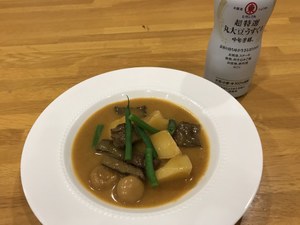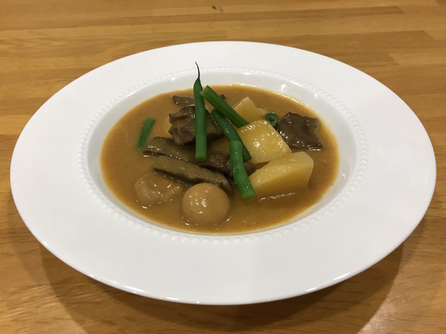 ジャガイモ、マッシュルームをいれ、煮込む。そして、淡口醤油で大さじ1をいれ、