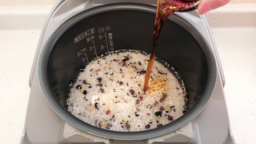 炊飯器の内釜に米2カップ、雑穀米1袋、淡口醬油大さじ2、水は炊飯器の内釜に書いてある、推奨の量よりもちょっと少なめに入れて、スイッチを入れます。