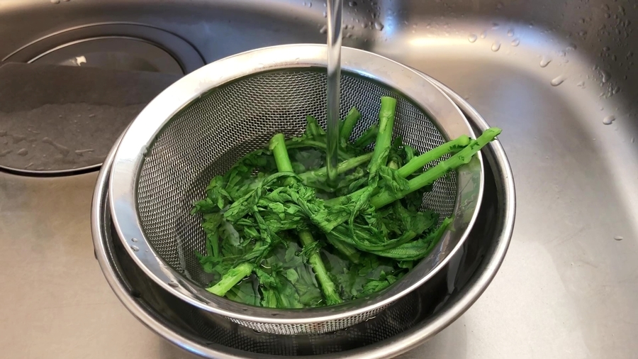 春菊は茹ですぎず、空炒りのときも炒り終えたらすぐに冷ましてください。