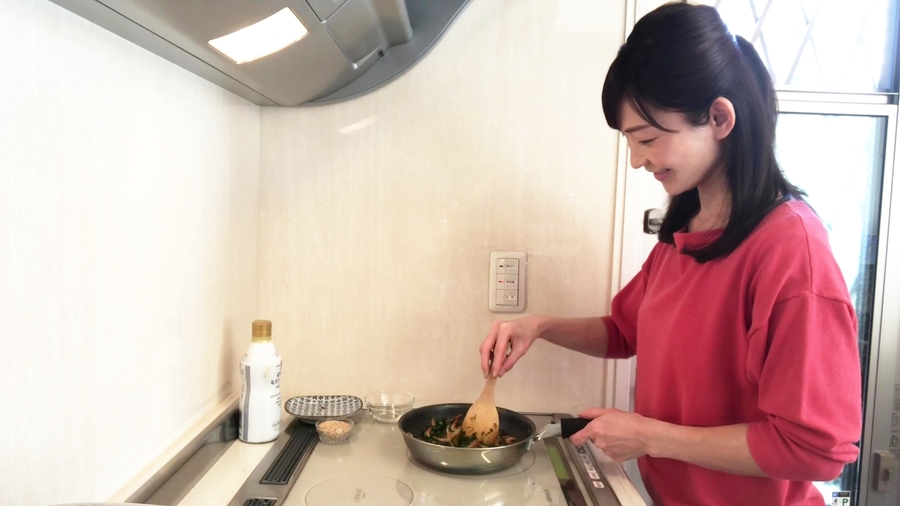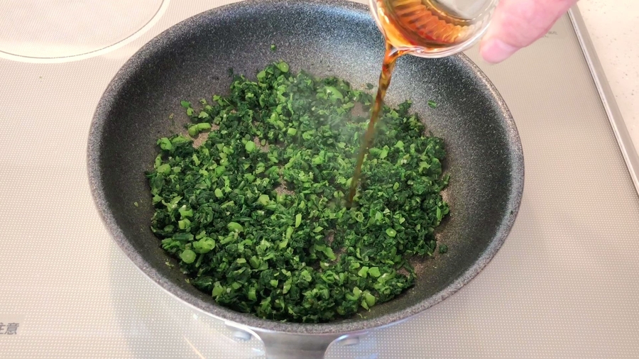 そして、絞った春菊を切り、また水気をとるために絞り、さらにもう一度春菊を切り、絞ります。すると粗みじんになり、水っぽさをなくします。それをフライパンに入れ、ホロホロになるように空炒りします。ホロホロになってきたら、淡口醤油大さじ1/2と油小さじ1/2を入れます。(色褪せ防止と味付けのため)