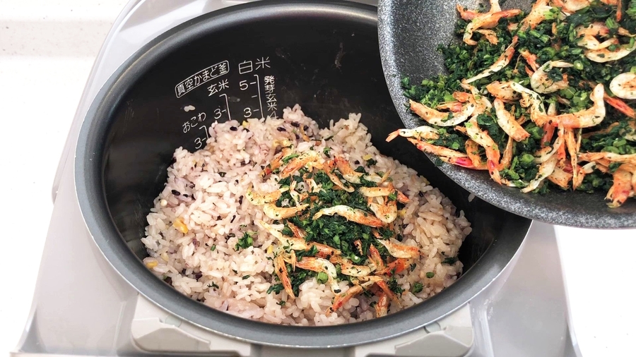 ご飯が炊けたら、春菊と桜海老を混ぜ、さらにいりごま大さじ2を入れます。