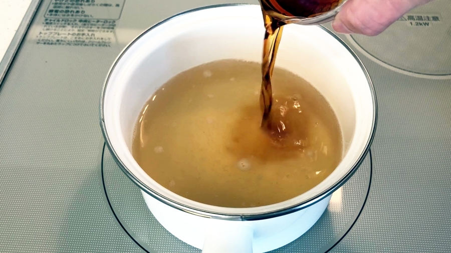 小鍋に水500cc、鶏がらスープ小さじ1/2、淡口醤油大さじ1、酒大さじ1を入れ、弱火にかけて、熱いスープ状態にしておきます。