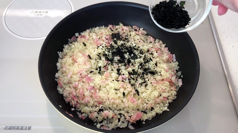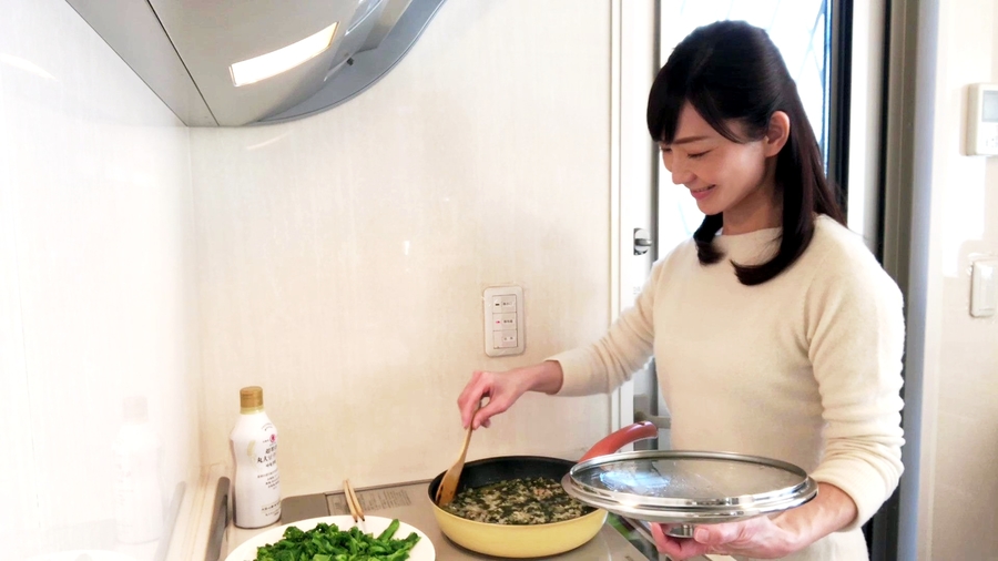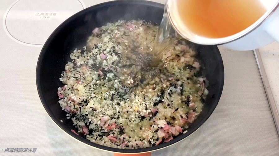 3~4分経ったら、火を止めて、軽くほぐし混ぜ、蓋をして、5~6分蒸らします。