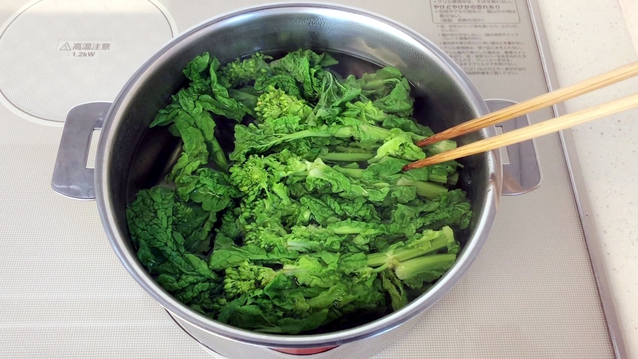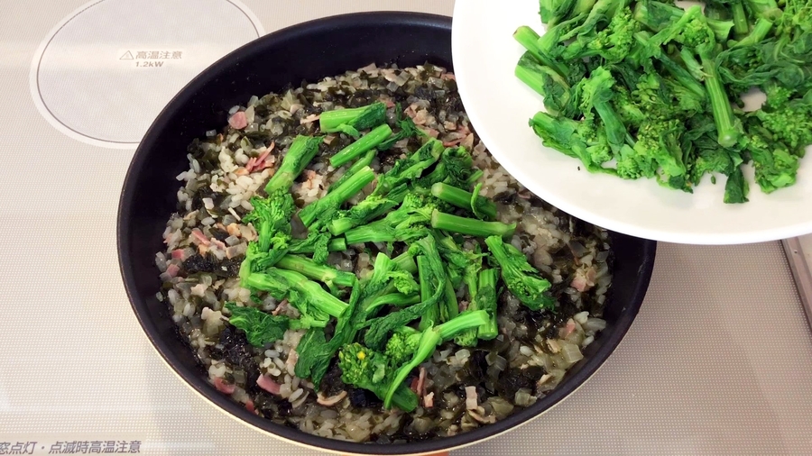 15分お米を茹でたら、水気を切った菜花を米の入ったフライパンに振り入れて、さらに3~4分弱火で煮ます。