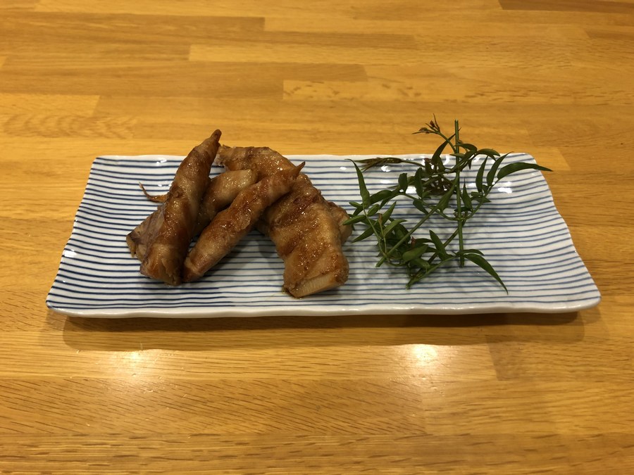 一つのタケノコにつき2枚豚バラ肉を2周ほど巻きます。キュッキュッキュと