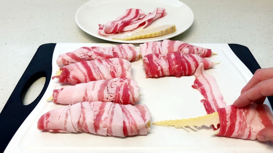 一つのタケノコにつき2枚豚バラ肉を2周ほど巻きます。