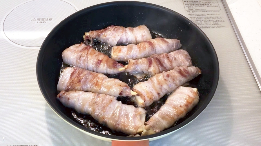 フライパンに油をしっかりなじませ、肉を巻いた、タケノコのお肉を両面きつね色に焼いていきます。