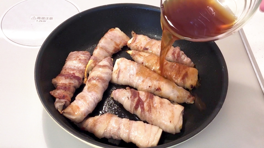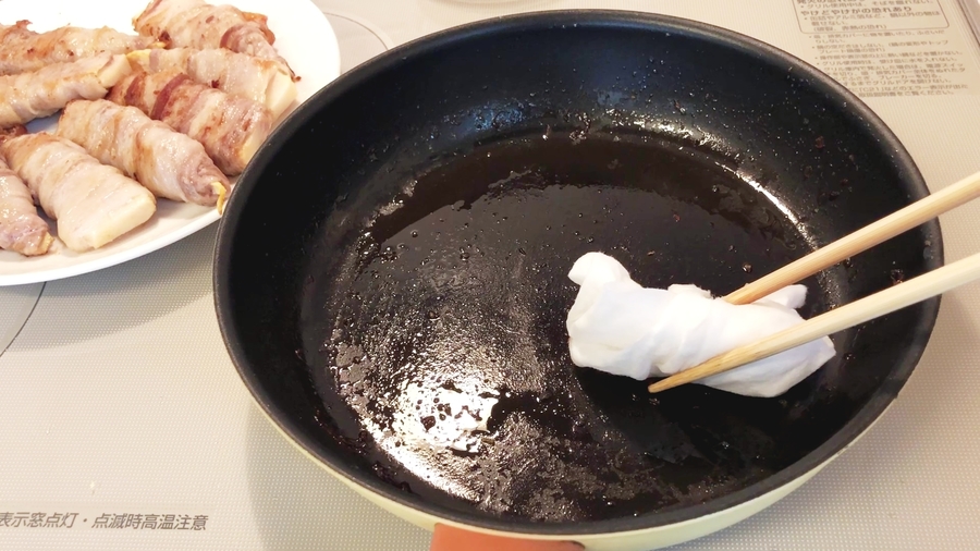 いったん火を止めて、肉巻きタケノコをいったんフライパンから出して、バラ肉から出た油をふき取ってください。