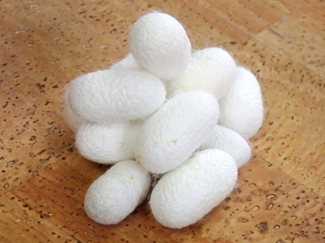 色はほぼ白。形がまゆの形をしています。これが「冷やしクリームパン」です。群馬県は富岡製糸場をはじめ養蚕業が盛んだったところで、それにちなんでいます。