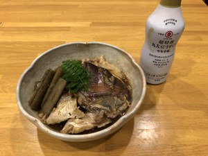 次に落とし蓋を取り、淡口醤油大さじ2をいれ、煮汁を鯛にかけまわしていきます。