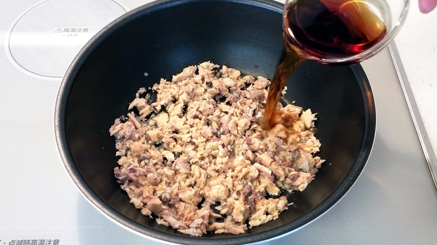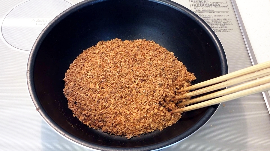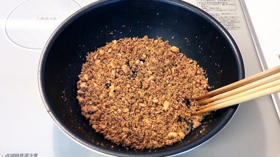 蒸気が収まったら再び火にかけて煎り付けて、蒸気が出たら火を止め、余熱で混ぜるというのを鮭がパサパサになるまで何回か繰り返します。
