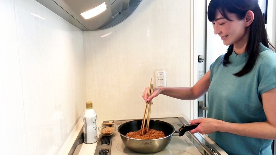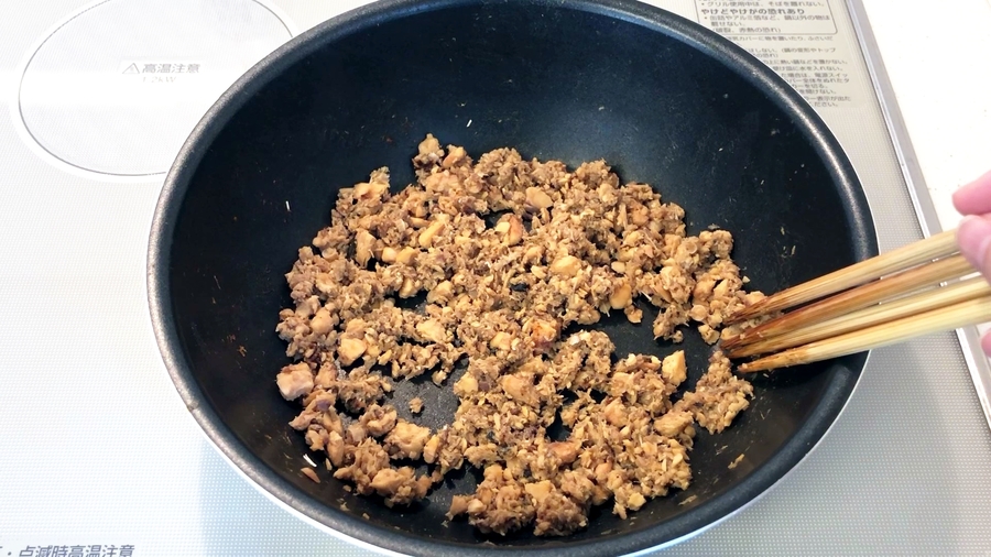 かき混ぜる際に、菜箸を4本ほど持って、煎り付けるのがおススメです。