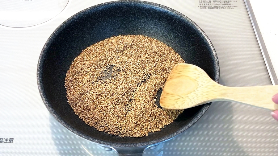 別の鍋で炒り胡麻をさらに香ばしく炒り、いい香りがしたら、キッチンペーパーの上に移します。
