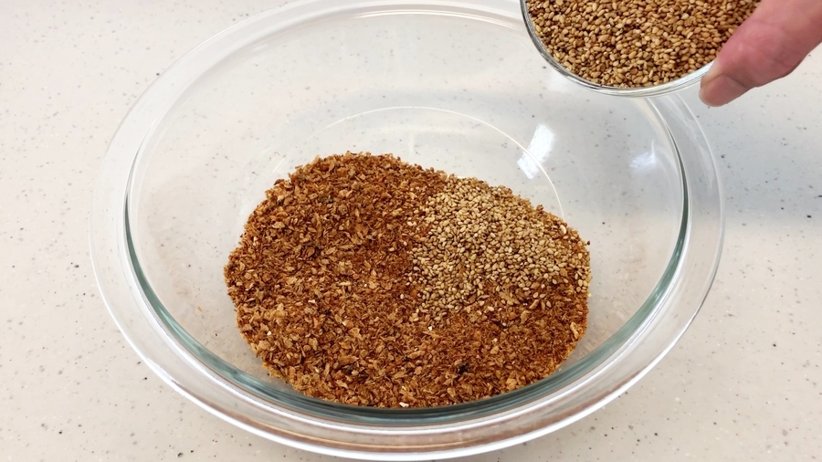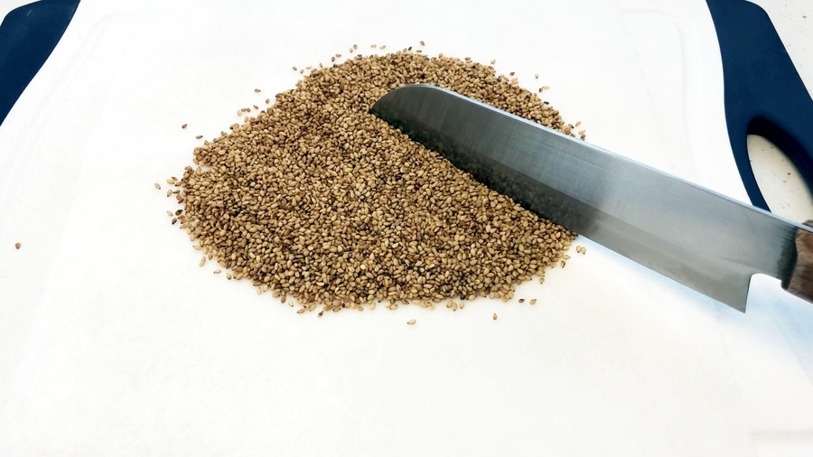 炒った胡麻を包丁で切ります(または指でつぶしても良いです)。