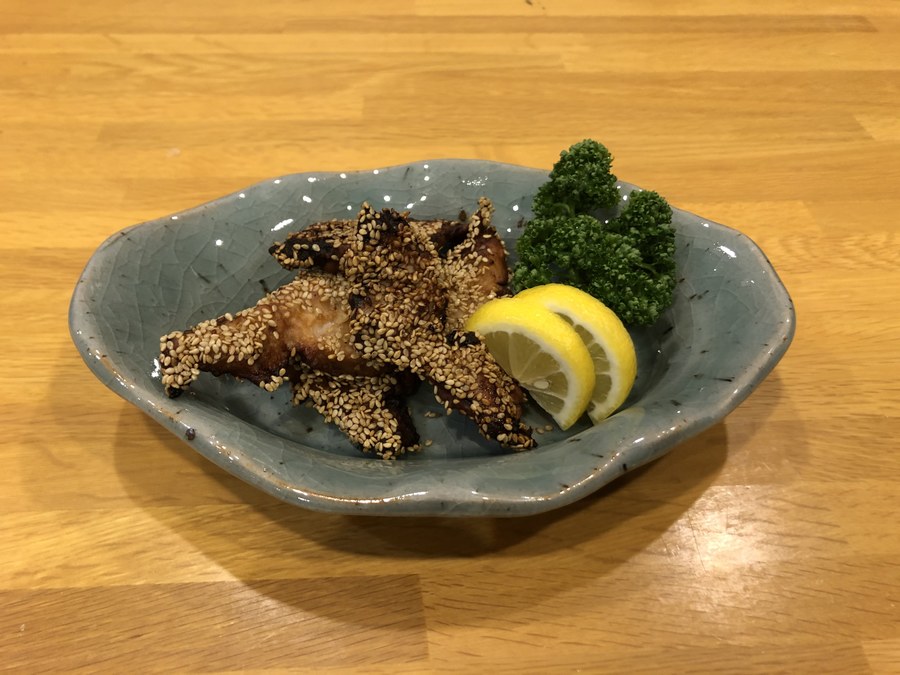 ⑤別のバットに炒り胡麻を薄く引いて、③の表面にまぶし④に入れ、