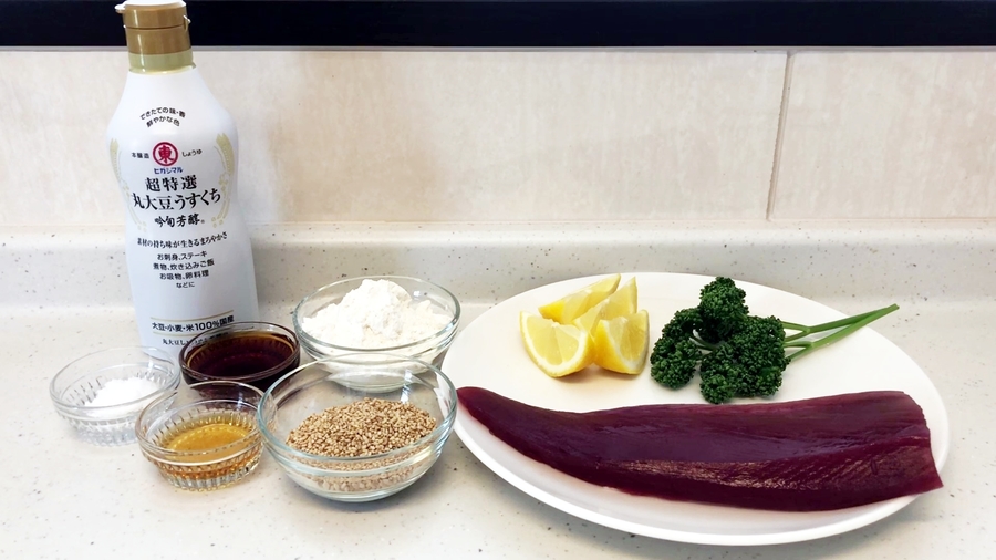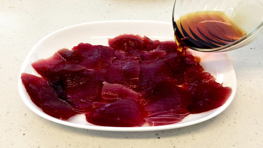淡口醤油大さじ2、砂糖小さじ1、みりん小さじ2の下味をバットに作り、カツオを重ならないように15分くらい漬け込みます。