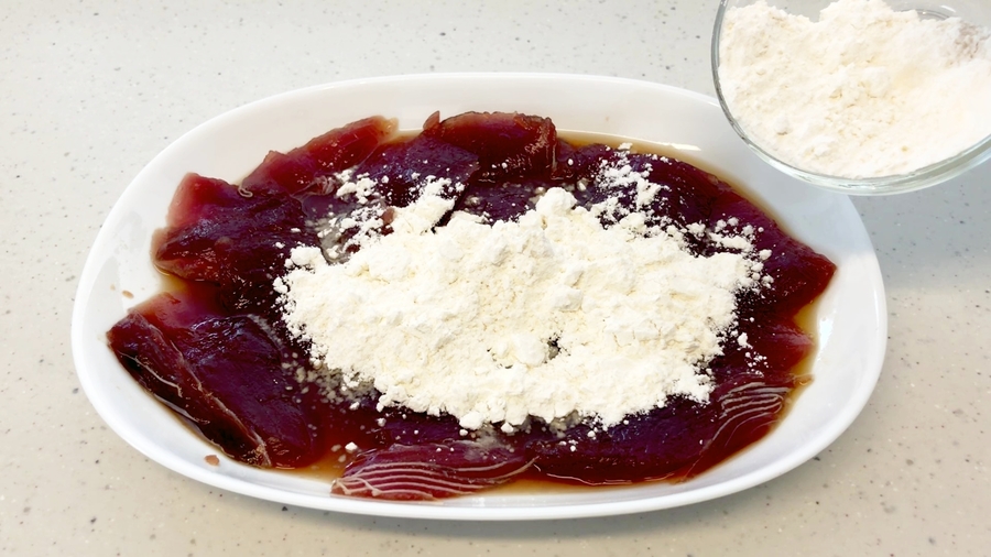 下味を漬けたカツオとタレの器の中に薄力粉大さじ5~6をふりかけ、身が崩れないように全面に粉をまぶします。
