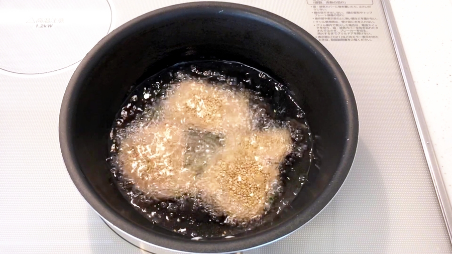 油が170℃になったら、3分ほどかけて、こんがり揚げます。