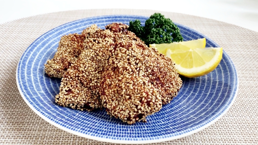 その間に別のバットに炒り胡麻を薄く引いて、カツオの表面にまぶします。