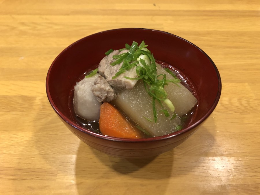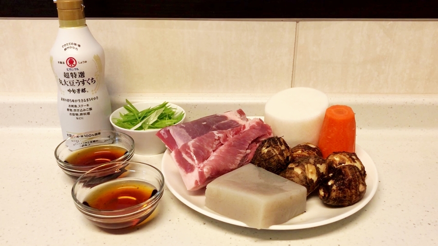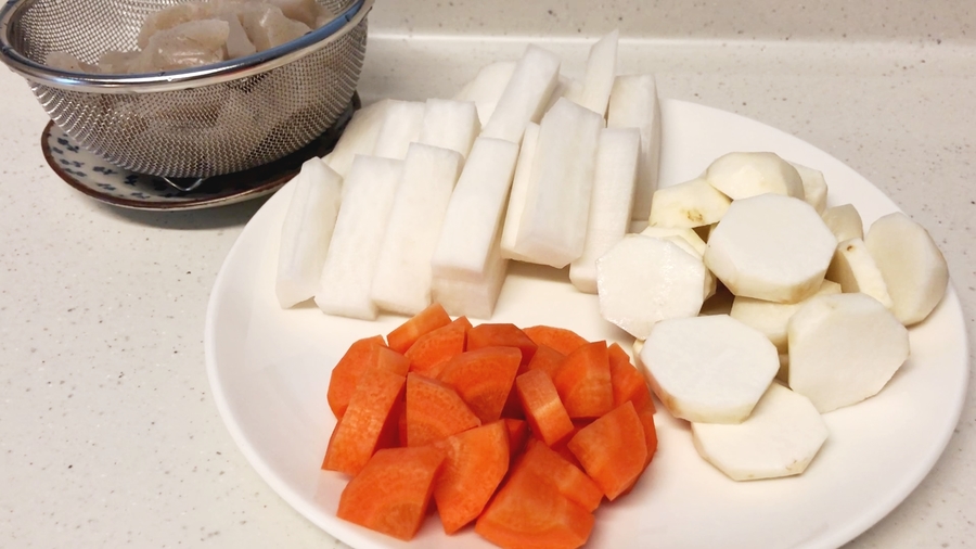大根300gは太めの拍子木切り、ニンジン100gは厚めの半月切り、サトイモ200gは、皮をむき、1センチの厚さの輪切りにします。