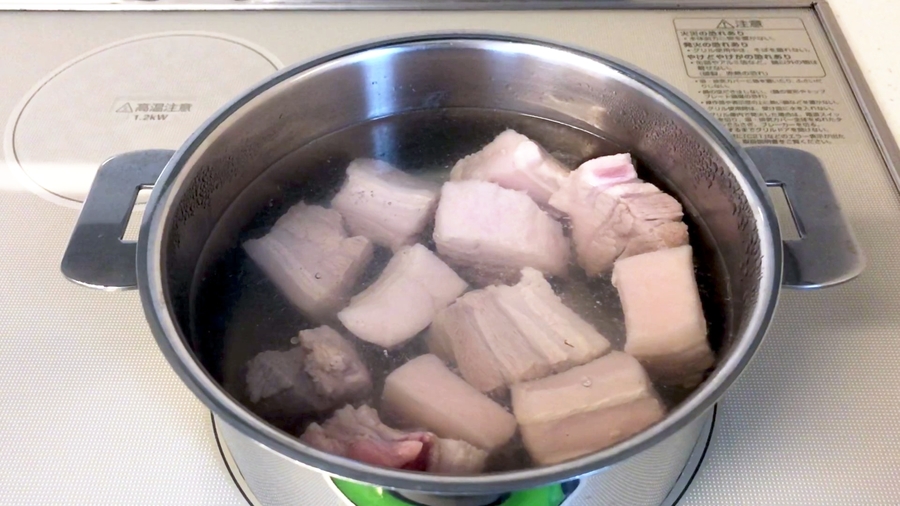 豚バラブロック400gは大きめの一口大に切りまして、沸騰したお湯に入れたら、すぐ火を止めます。