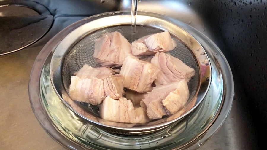 お肉の表面全体が白っぽくなったら、ぬるま湯で洗い流し、アク止めをします。そして、水気をしっかりとふき取ります。
