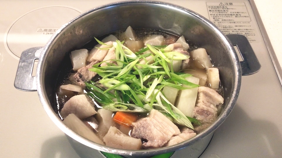 蓋つきの鍋に豚肉と野菜、コンニャクを入れ、水1/2カップと(A)(淡口醤油大さじ1、酒大さじ2)を入れて、蓋をして、蒸し煮にします。