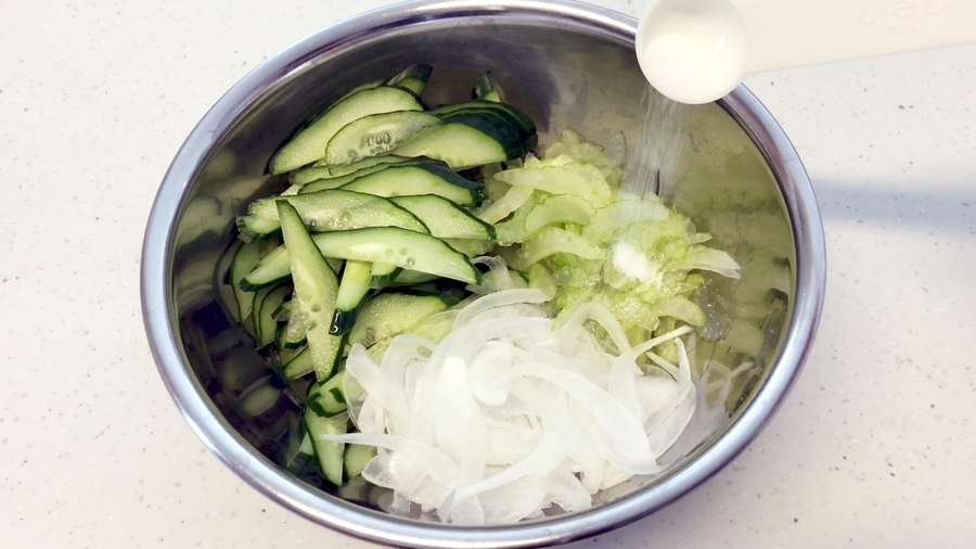 切ったキュウリ・タマネギ・セロリをすべて合わせて、塩小さじ1/3をふりかけ、ざっと混ぜ10分程度置いて、絞って水気を切ります。