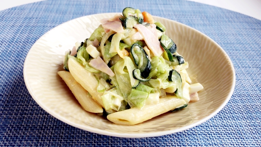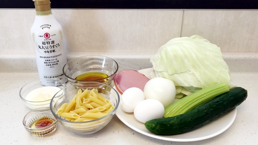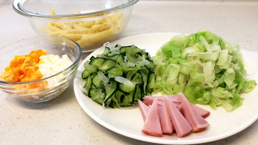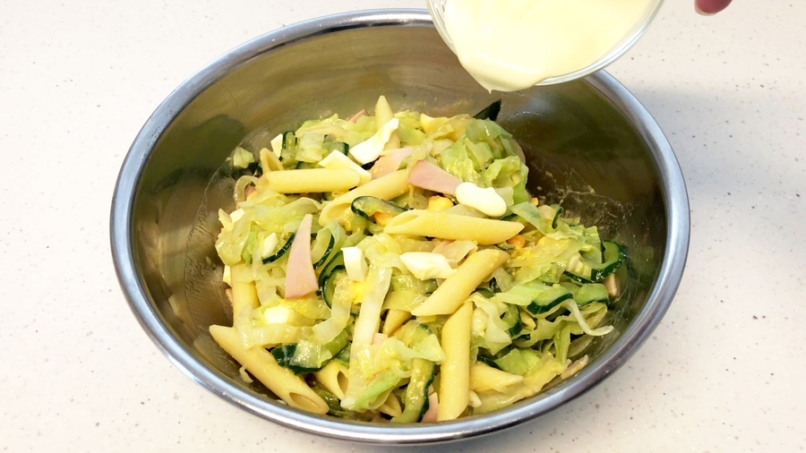 マカロニ、野菜、ハム、ゆで卵に調味液をかけてよく和えます。